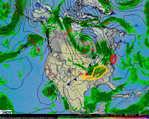 Severe weather is anticipated tonight as a line of storms ahead of a shortwave trough and low level jet move toward the coastal areas of the Mid Atlantic and Lower New England. Damaging winds and embedded tornadoes will be possible. Activity will likely occur overnight tonight. Thunderstorms will also be possible along a frontal boundary from the Ohio and Tennessee Valleys into the Southern Plains. Although instability is weak, strong shear in place will allow for the potential for thunderstorms with hail and strong wind gusts.