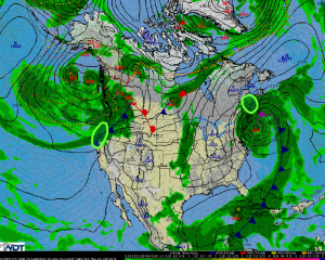 An area of low pressure slowly lifting over the Northeast will allow for heavy rain for portions of Southern and Central Maine. Up to 2 inches of rain and localized flooding will be possible. For the Pacific Northwest, showers will continue into the afternoon as a disturbance advances onshore. 2-3 inches of rain and localized flooding will be possible.