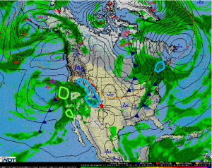 An area of low pressure will allow for a series of disturbances across the Rockies. Moderate to heavy snow will be possible for the higher elevations of the Northern and Central Rockies. 4-8 inches of snow will be possible.