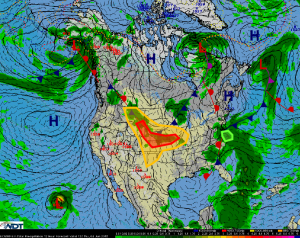 An upper level disturbance moving out of the western US will interact with a weak cold front dropping slowly southeastward across central portions of the country today. This will help provide a focus for strong to severe thunderstorms for the Central Plains and adjacent areas. Thunderstorms are expected to re-develop and re-intensify this afternoon and evening with more organized activity overnight into Friday morning. Large hail, damaging winds, and tornadoes will be possible, though tornadoes will be most likely this afternoon and evening. Multiple rounds of thunderstorms may also lead to a heavy rain threat for portions of the lower Missouri River Valley with rainfall in excess of 2 inches.