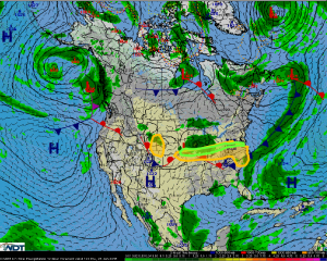 Further east, an area of low pressure and a cold front are expected to move through the Central US and Midwest. This will pose a broad swath of thunderstorm activity with large hail and damaging winds being possible from the Central Plains to the Mid Atlantic. A few isolated tornadoes will be possible near the Delmarva region.